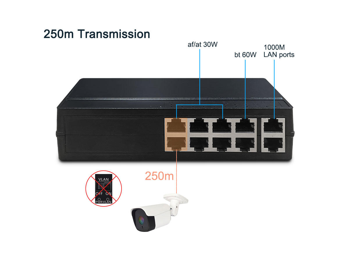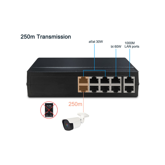 - Portok: 8 darab 100Mbps PoE port és 2 darab 1000Mbps up-link port.