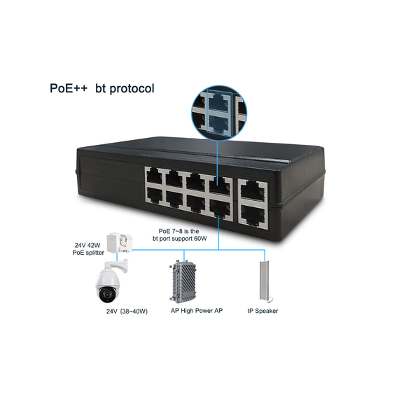 - Portok (7-8): IEEE 802.3af/at/bt, akár 60W teljesítmény támogatása
