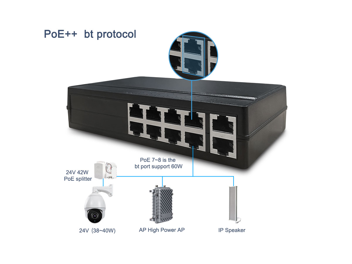 | Protokoll támogatás | IEEE 802.3af/at (1-6. port), IEEE 802.3af/at/bt (7-8. port, max. 60W) |