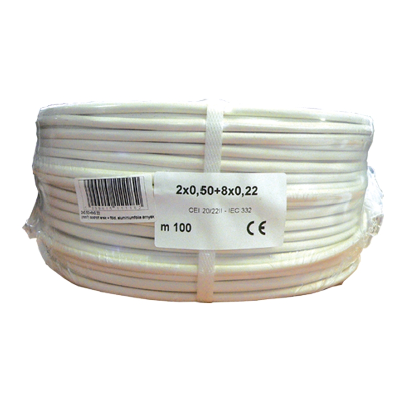 HONNOR SECURITY Biztonságtechnikai kábel, 2+8 eres , 2x0,5 mm2 és 8x0,22 mm2 névleges keresztmetszetű sodrott réz erek, alumíniumfólia árnyékolás, fehér PVC köpeny