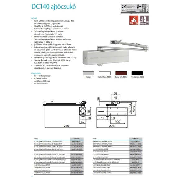 ASSA ABLOY Ajtóbehúzó test, ezüst, max. 1400 mm ajtószélességig, max 120kg-os ajtókig, állítható kar magasság (14mm), csukóerő: EN 3-6, Méret (HxSZxM):306 x 69 x 63 mm, Súly:2,1 kg.