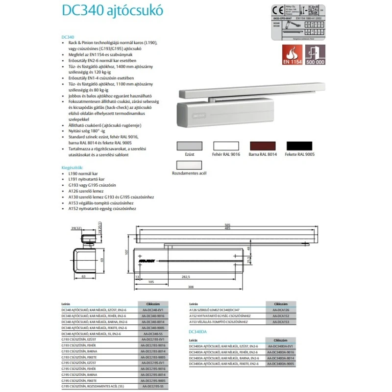 - Záróerő: EN méret 2-6 / 1-4 / 2-4 (összekötőkar / vezetősín / DC340DA vezetősín)