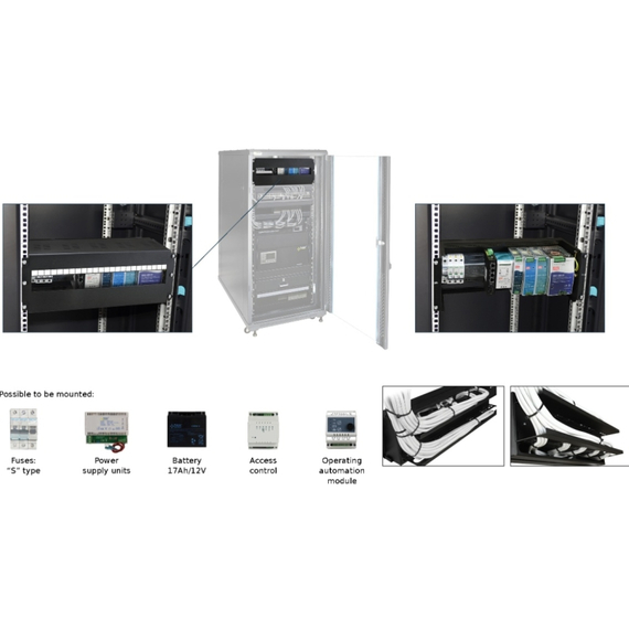 - DIN sín kapacitás: 1 db 427 mm hosszú sín, amely 24 db „S” méretű eszköz fogadására alkalmas.