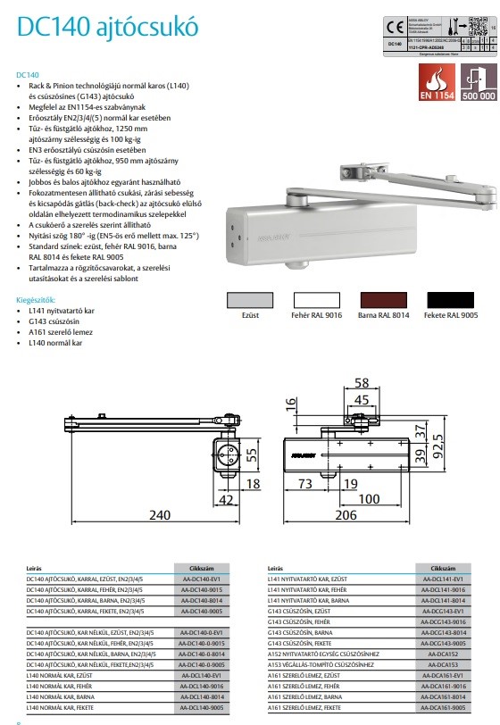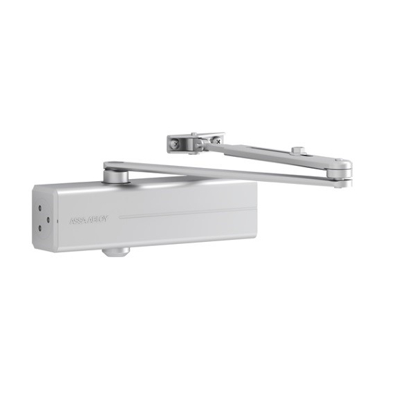 ASSA ABLOY Ajtóbehúzó test, ezüst, max. 1400 mm ajtószélességig, max 120kg-os ajtókig, állítható kar magasság (14mm), csukóerő: EN 3-6, Méret (HxSZxM):306 x 69 x 63 mm, Súly:2,1 kg.
