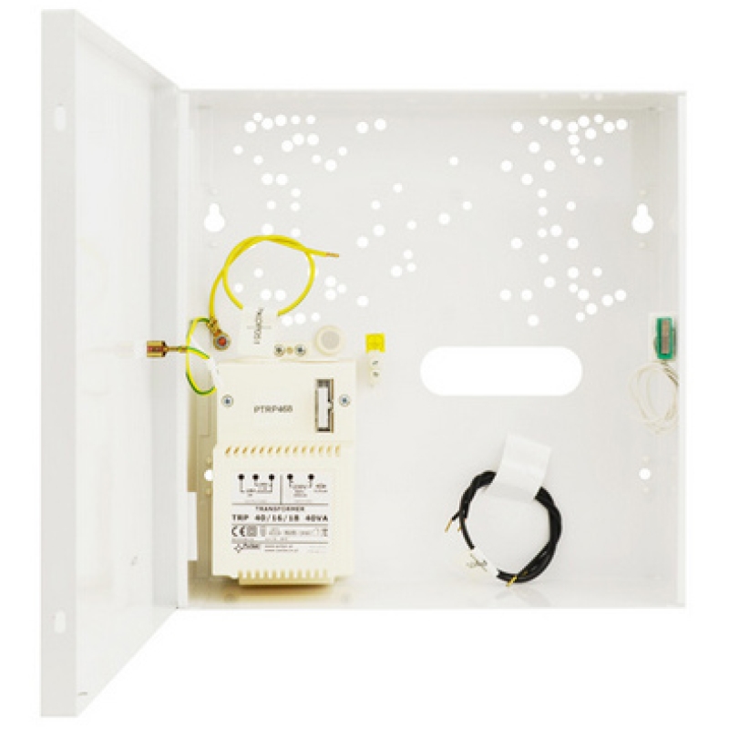 PULSAR Fémház transzformátorral, 7, TRP40, DSPR/S, DSC, PARADOX, RISCO, SATEL, PYRONIX, CROW, TELMOR, SUMMIT, ROEL, EBS eszközökhöz, 230/16/18 Vac 40 VA transzformátor, kimeneti áram (16/18 Vac) 2.2/2 A, 12 V/7 Ah akkumulátorhely, fehér színű acéllemez ház, szabotázskapcsoló, 0.5 A@50 Vdc, működési hőmérséklet -10°C~+40°C, méret 255x255x88 mm