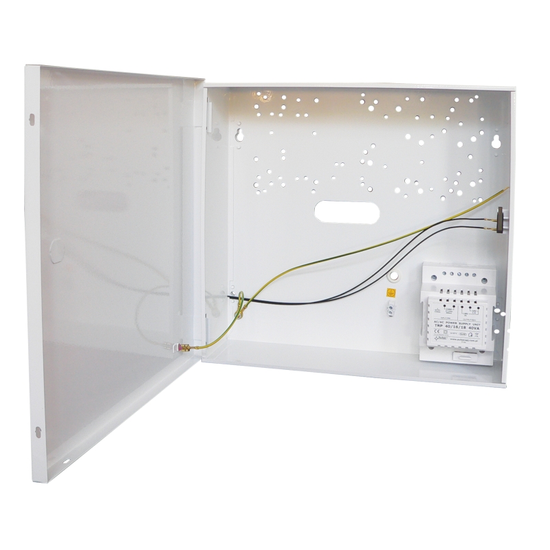 PULSAR Transzformátor szabotázsvédett fém dobozban, 320x300x90mm, tápegység: 40VA, 18V/2A, 16V/2.2A, ajtóföldelés, bekötőkábelek, 12V/17Ah akkuhely, SATEL, DSC, PARADOX, ROKONET, PYRONIX és TEXECOM előfuratok az AWO205 utódja/helyettesítője