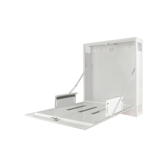 PULSAR kisméretű szabotázsvédett fém doboz, videorögzítők illetéktelen hozzáférés elleni mechanikus védelme, függőleges falra történő felszerelés, vízszintesen lenyitható előlap, 145~345 mm szélesség között állítható belső tartófülek, kettős - kinyitás és falról történő eltávolítás elleni - szabotázsvédelem, mechnanikus zár, 1 mm vastagságú acéllemez ház, méret külső/belső 435x500x130 / 385x495x110 mm, beltéri alkalmazás, fehér szín, működési hőmérséklet -10°C~+40°C