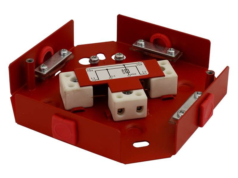 PULSAR Szétosztó kötődoboz 0,375A biztosítékkal, CNBOP-PIB megfelelőségi tanúsítvány, megfelel: No. AT-0601-0422/2014., Tűzállósági osztály: E30, E60, E90, Feszültség: 125V AC max., Áram terhelhetőség: max 0,375A, Dobozba bevezethető kábel keresztmetszet: max. 10 mm.Beköthető vezeték keresztmetszet: max. 2,5 mm2, Védelmi osztály: IP20, Doboz anyaga: DC01 1mm acéllemez, szín: RAL3001 (piros), Méret: 120x120x37