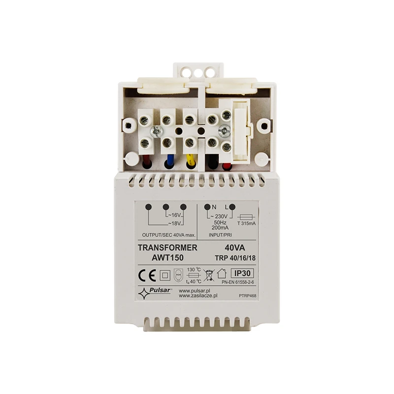 PULSAR biztonsági transzformátor, TRP 40VA/16V/18V, 230 Vac, teljesítmény 40VA, kimeneti feszültség 16Vac/2.2A és 18Vac/2 A, T315mA/250V üvegcsöves primer biztosíték, 130°C termikus védelem, IP30, működési hőmérséklet -10°C~+40°C, méret 124x72x70 mm