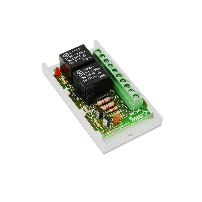 PULSAR relémodul, pozitív és negatív indítójel bemenet, 2 db 1 váltóérintkezős relé, érintkezők maximális terhelése 50 Vac / 2A, visszajelző LED, tápfeszültség 12/24 Vdc, max áramfogyasztás 75 mA, csavaros vagy öntapadós rögzítés, méret 80x22x43 mm, működési hőmérséklet -10~+50°C, CE, RoHS