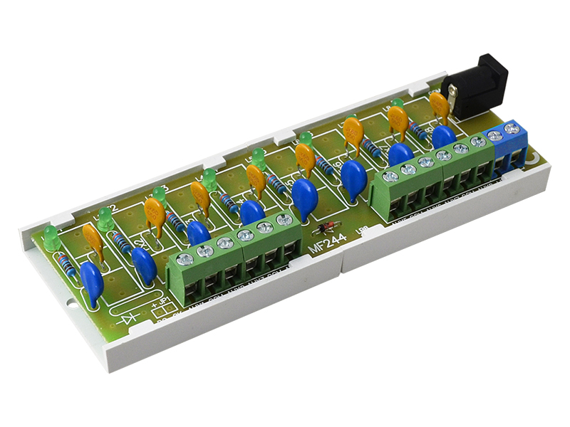 PULSAR PTC biztosíték modul. Feszültség: 10÷30VDC. Kimeneti feszültség: 8x0,5A - PTC. Vezeték keresztmetszet: max. 1mm2. Bemenetek/kimenetek száma: 2/8. Védelem: SCP, OLP*, túlfeszültség védelem. Kiegészítő funkciók:- tápfeszültség bemenet - DC 5.5/2.1 aljzat. - LED kijelzés. Rögzítési opciók: rögzítő keret csavarral vagy kétoldalas ragasztóval. Méret: Mé=124, Szé=43, Ma=21 (+/-2mm). Megjegyzés:- szétosztó/kötő modul. - rögzíthető PSD (asztali) sorozatú tápegységeken