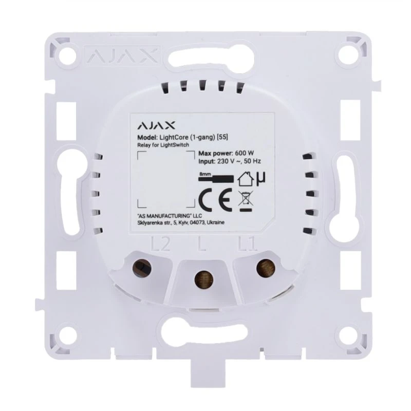 Kérjük, vegye figyelembe, hogy az Ajax LightCore (1-gang) csak a LightSwitch rendszer egyik összetevője. Az összes többi szükséges alkatrészt külön kell megvásárolni. Például, ha egy teljes értékű LightSwitch kapcsolót szeretne összeállítani ezzel a relével, akkor egy SoloButton (1-gang/2-way) gombot is meg kell vásárolnia.