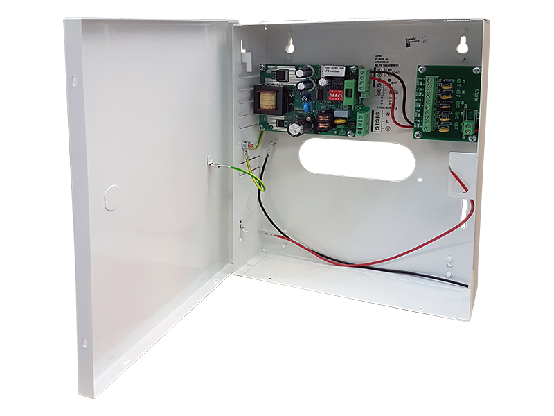 MAKRAI CCTV tápegység, szünetmentesített intelligens, bemeneti feszültség 230 V AC, kimeneti feszültség 12~13,8 V DC, 5 db 1 A kimenet, max. összesített kimeneti áram (kimenet + akkumulátortöltés) 4 A, akkumulátorhely 12V 7Ah, max. 1 A töltőáram, hibajelző LED-ek és kimenet, max. 30 vdc / 0,1 A, UPS és PS üzemmód, túlterhelés/rövidzár/túlmelegedés/túlfeszültség/mélykisütés/akku fordított polarítás elleni védelem, IP20, méret 215x265x78 mm, működési hőmérséklettartomány -10°C~+40°C