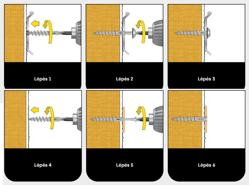 - Előfúrás nélküli rögzítés: Az éles fúróhegynek köszönhetően 7 mm vastagságig nincs szükség előfúrásra a vakolaton.
