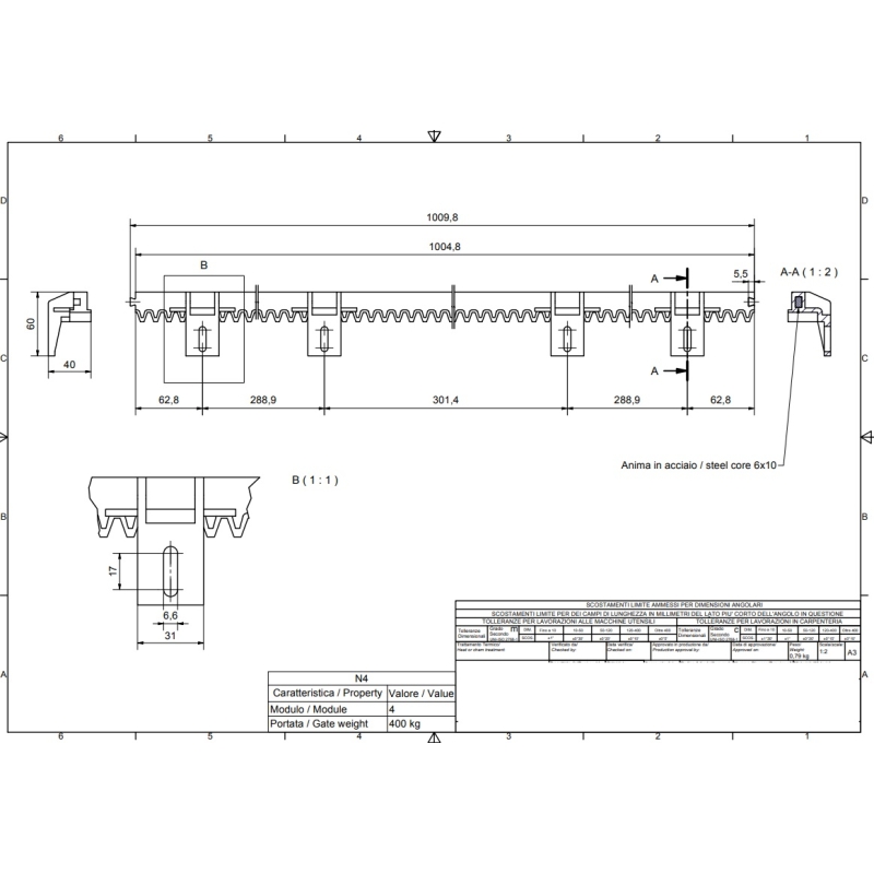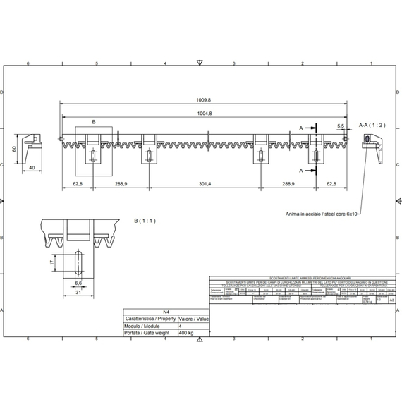- Anyag: Fémszál erősítésű műanyag – a fogasléc belsejében futó acélszálak növelik a szerkezeti szilárdságot, csökkentik a deformációt, és biztosítják a hosszú távú működést még intenzív igénybevétel esetén is.
