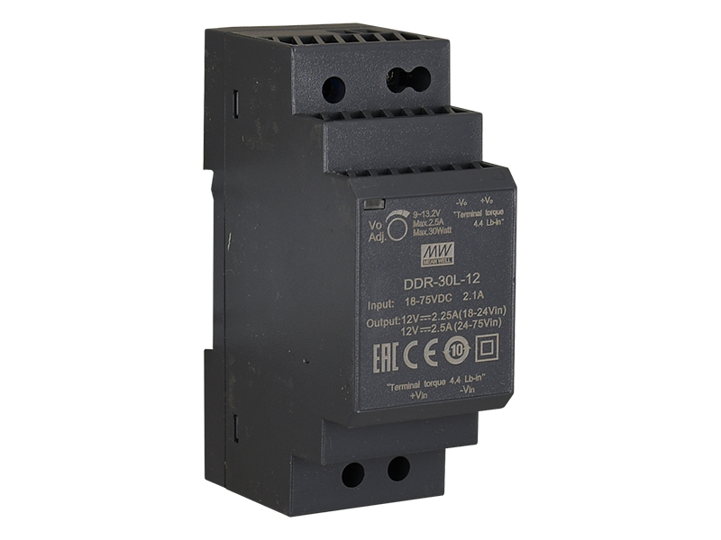 PULSAR DC/DC átalakító DIN sínhez. Tápfeszültség: 18÷75VDC. Kimeneti feszültség: 2,5A/12VDC. Feszültség beállítási tartomány: 9÷13,2VDC. Hatásfok: 89%. Védelem: SCP, OLP, OVP*. Méret: Szé=35 Ma=90 Mé=54,5 mm