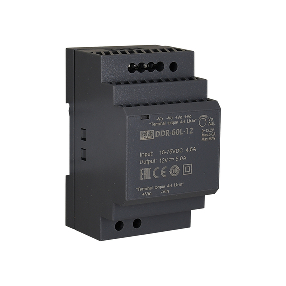 PULSAR DC/DC átalakító DIN sínhez. Tápfeszültség: 18÷75VDC. Kimeneti feszültség: 5A/12VDC. Feszültség beállítási tartomány: 9÷13,2VDC. Hatásfok: 91%. Védelem: SCP, OLP, OVP*. Méret: Szé=52,5 Ma=90 Mé=54,5 mm