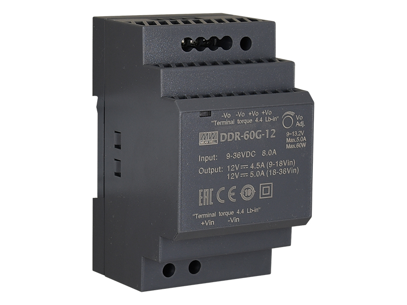 PULSAR DC/DC átalakító DIN sínhez. Tápfeszültség: 9÷36VDC. Kimeneti feszültség: 5A/12VDC. Feszültség beállítási tartomány: 9÷13,2VDC. Hatásfok: 91%. Védelem: SCP, OLP, OVP*. Méret: Szé=52,5 Ma=90 Mé=54,5 mm