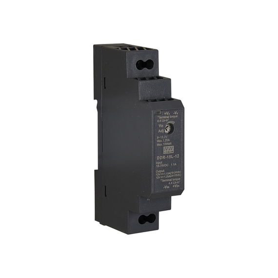 PULSAR DC/DC átalakító DIN sínhez. Tápfeszültség: 18÷75VDC. Kimeneti feszültség: 1,25A/12VDC .Feszültség beállítási tartomány: 9÷13,2VDC. Hatásfok: 86%. Védelem: SCP, OLP, OVP*. Méret: Szé=17,5 Ma=90 Mé=54,5 mm
