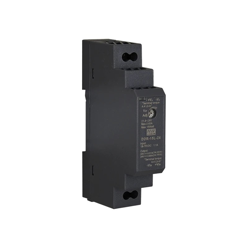 PULSAR DC/DC átalakító DIN sínhez. Tápfeszültség: 18÷75VDC. Kimeneti feszültség: 0,63A/24VDC. Feszültség beállítási tartomány: 26,1÷28VDC. Hatásfok: 87%. Védelem: SCP, OLP, OVP*. Méret: Szé=17,5 Ma=90 Mé=54,5 mm