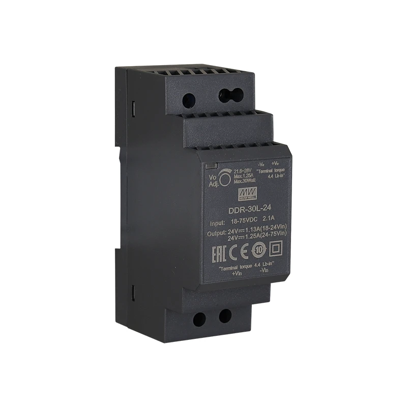 PULSAR DC/DC átalakító DIN sínhez. Tápfeszültség: 18÷75VDC. Kimeneti feszültség: 1,25A/24VDC. Feszültség beállítási tartomány: 21,6÷28VDC. Hatásfok: 91%. Védelem: SCP, OLP, OVP*. Méret: Szé=35 Ma=90 Mé=54,5 mm