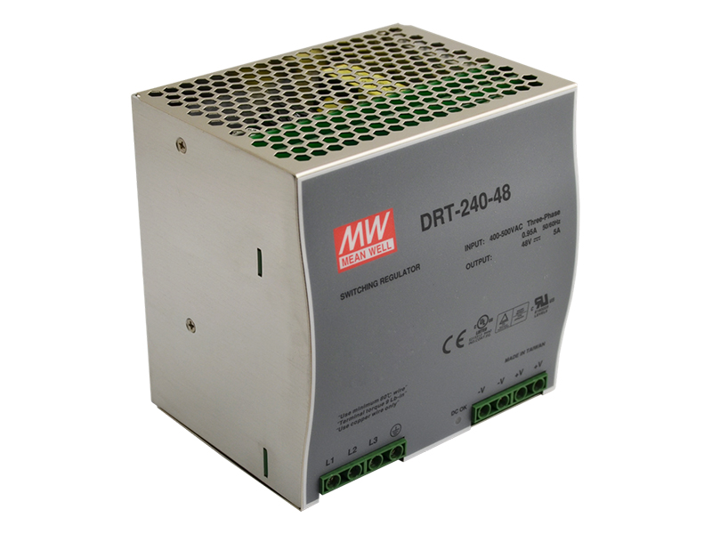 DIN sínes tápegység. Tápfeszültség: Három fázis 340÷550VAC / 480÷780VDC. Kimeneti feszültség: 5A/48VDC. Feszültség beállítási tartomány: 48V÷55V. Hatásfok: 89%. Védelem: SCP, OLP, OVP, OHP*. Méret: Szé=126 Mé=126 Ma=100mm