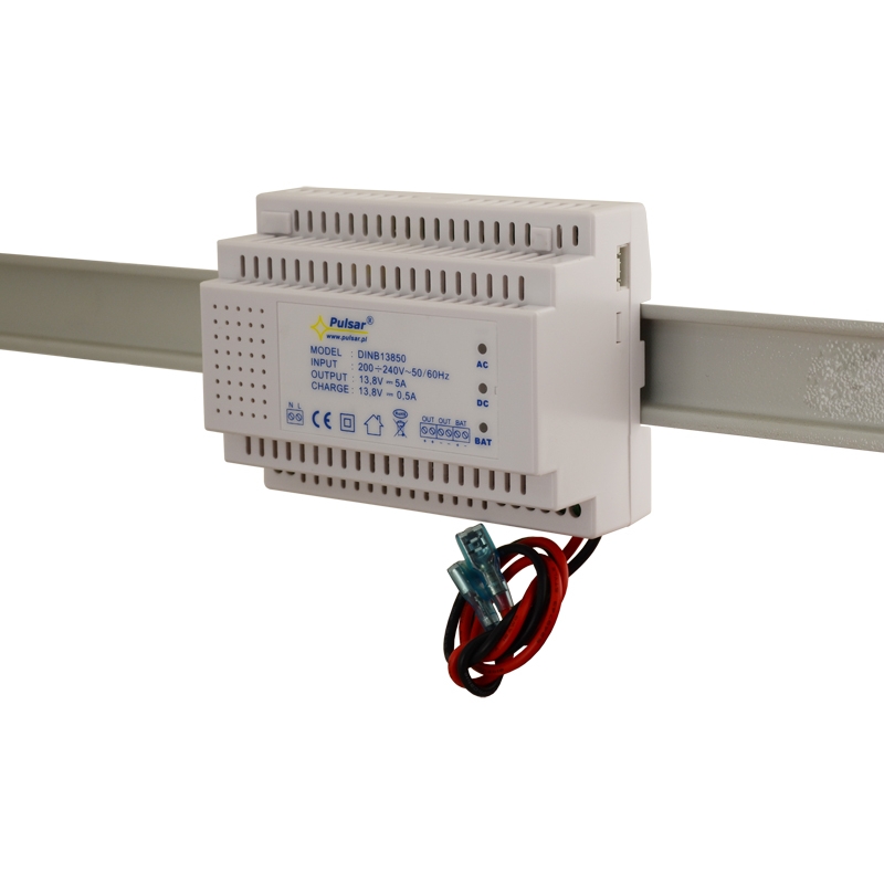 PULSAR kapcsolóüzemű tápegység akkumulátortöltővel, kimenet 13.8 Vdc/5 A, 9.5~13.8 Vdc között állítható kimeneti feszültség, kimeneti áram 5 A (tAMB<30°C) / 3.5 A (tAMB=40°C) kimenet és 0.5 A akkumulátortöltés, bemeneti feszültség 176~264 Vac, max. 75 W, hatásfok 85%, túlfeszültség védelem, DIN sínre szerelhető, akkumulátortöltő kimenet rövidzár és fordított polarítás elleni védelem, mélykisütés elleni védelem, méret 122x93x60 mm, működési hőmérséklet -10°C~+40°C, CE, RoHS