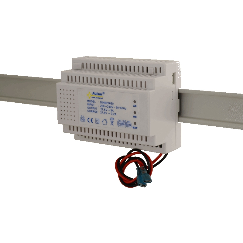 PULSAR kapcsolóüzemű tápegység akkumulátortöltővel, kimenet 27.6 Vdc/3 A, 19~27.6 Vdc között állítható kimeneti feszültség, kimeneti áram 3 A (tAMB<,30°C) / 2.1 A (tAMB=40°C) kimenet és 0.2 A akkumulátortöltés, bemeneti feszültség 176~264 Vac, max. 90 W, hatásfok 88%, túlfeszültség védelem, DIN sínre szerelhető, akkumulátortöltő kimenet rövidzár és fordított polarítás elleni védelem, mélykisütés elleni védelem, méret 122x93x60 mm, működési hőmérséklet -10°C~+40°C, CE, RoHS