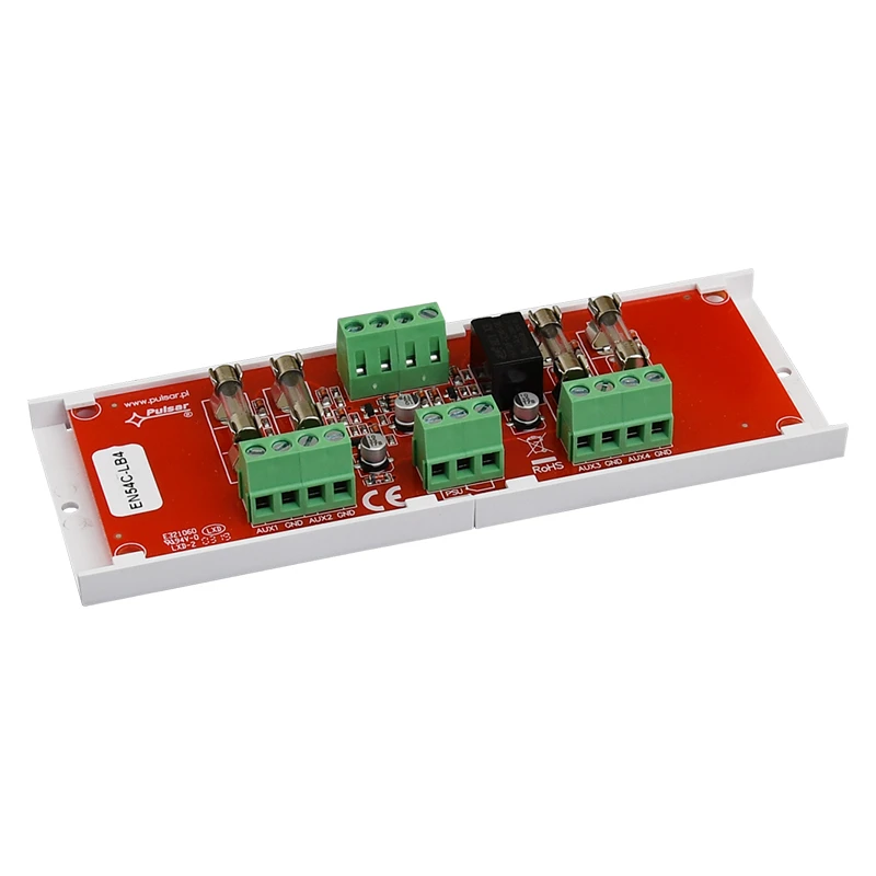 PULSAR FTA biztosíték modul EN54C. Feszültség: 20÷30VDC. Kimeneti tápfeszültség: 4x0,5A. Bemenetek/kimenetek száma: 2/4. Védelem: SCP*. Technikai kimenetek – relé:PSU – biztosíték kijelzés. LED kijelzés. Szerelési opció: lemezcsavarral x 2. Méret: Mé=150 Szé=52,5 Ma=27 [+/-2mm]. Megjegyzés:- üvegbiztosíték: F0,5Ax2 included. - kiemelten javasolt a következő tápegységekhez: EN54C / EN54M