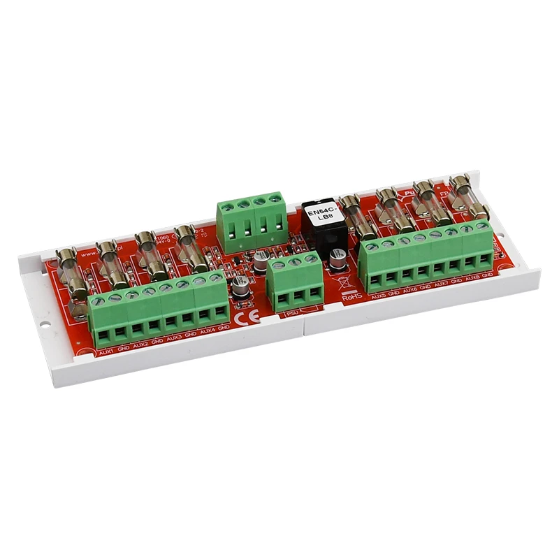 PULSAR FTA biztosíték modul EN54C. Feszültség: 20÷30VDC. Kimeneti tápfeszültség: 8x0,5A. Bemenetek/kimenetek száma: 2/8. Védelem: SCP*. Technikai kimenetek – relé:PSU – biztosíték kijelzés. LED kijelzés. Szerelési opció: lemezcsavarra x 2. Méret: Mé=150 Szé=52,5 Ma=27 [+/-2mm]. Megjegyzés:- üvegbiztosíték: F0,5Ax2 included. - kiemelten javasolt a következő tápegységekhez: EN54C / EN54M