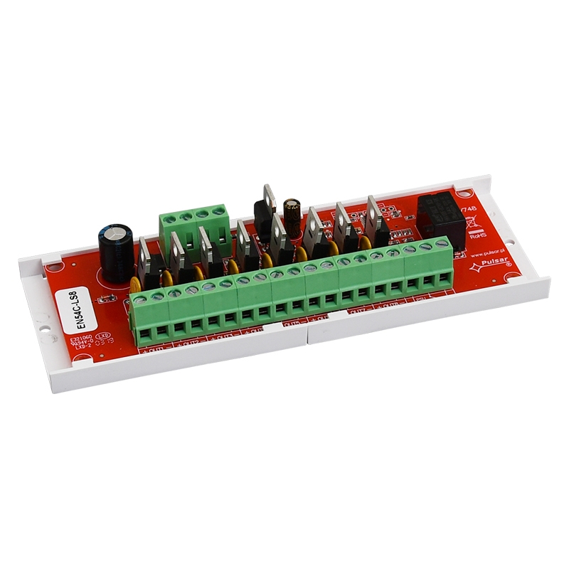PULSAR EN54C-LS8 szekvenciális modul hajtóművekhez visszatérő rugó nélkül. Feszültség: 20÷30VDC. Kimeneti tápfeszültség: 8x0,5A. Bemenetek/kimenetek száma: 1/8. Bemenetek: INPUT – parametric (2x4,7k). Védelem: OLP*. Technikai kimenetek – relé:. PSU – parametric input failure INPUT. LED kijelzés. Szerelési opció: lemezcsavarral x 2. Méret: Mé=150 Szé=52,5 Ma=27 [+/-2mm]. Megjegyzés:- kiemelten javasolt a következő tápegységekhez: EN54C / EN54M. - sequentially switching of receivers, with a delay of 100 ms