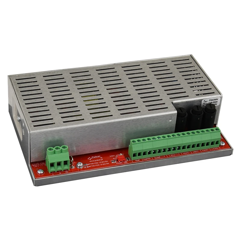 PULSAR tápegység modul a beépített tűzjelző rendszerekhez. Tápfeszültség: 230VAC. Kimeneti feszültség:1,6A / 27,6VDC – folyamatos működéshez – Imax a. -2,0A / 27,6VDC – időszakos működéshez – Imax b (5min). Akkumulátor töltőáram: 0,4A. Akkumulátorok: 2x7,2Ah/12V. PSU rendszer áramfelvétele: 52 mA. Hatásfok: 88%. Védelem: SCP, OLP, OVP, UVP*. Technikai kimenetek:EPS FLT – feszültség hiba AC, ALARM – collective failure. Megfelel az szabványoknak: EN 54-4, EN12101-10. Teljesítmény nyilatkozat CNBOP-PIB No. 1438-CPR-0630. Méret: Mé=200, Szé=120, Ma=48 [+/-2 mm]