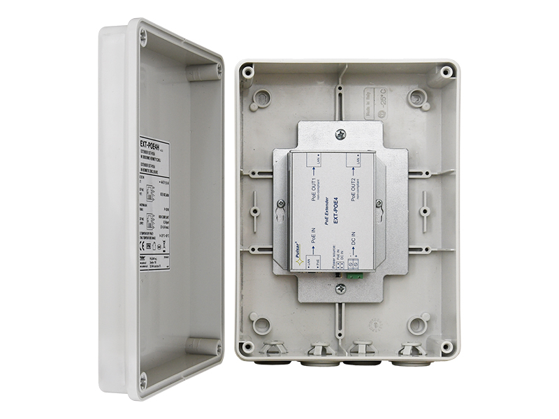 PULSAR hermetikusan zárt doboz. Terveztt felhasználás: Increases Ethernet and PoE power range by 100 meters. Allows connecting two IP-PoE cameras using a single cable. Additional power input: 44÷57VDC (csatlakozás: sorkapocs). PoE input: PoE IN - compliant with IEEE802.3af/at. PoE kimenet: PoE OUT1 / PoE OUT2 - nem felel meg az IEEE802.3af. Kimeneti áram PoE OUT: 0,3A/port (0,4A max.). Védelem: OLP, SCP*. Méret: W=158 H=118 D=77 [+/- 2mm]. The number of cable glands/cable diameter: 4pcs. / 4÷8mm. Megjegyzés:10Mbit/s és 100Mbit/s hálózatokhoz használható. hermetikus doboz IP56, surface mounted enclosure, locking – bolted. pole mounting option (requires the OZB1 adapter - optional accessory)
