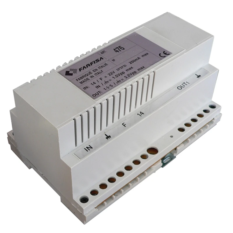 A FARFISA Erősítő és Videojel Elosztó egy olyan eszköz, amelyet elsősorban többkamerás rendszerekhez terveztek. Az eszköz képes öt különböző irányból érkező videójel fogadására, azok erősítésére, majd továbbítására a kívánt célállomások felé. Az állítható jelerősítés (3.5–9 dB) lehetővé teszi a jelek optimális szintre hozását, így biztosítva a kiváló képminőséget még hosszabb kábelezés esetén is.