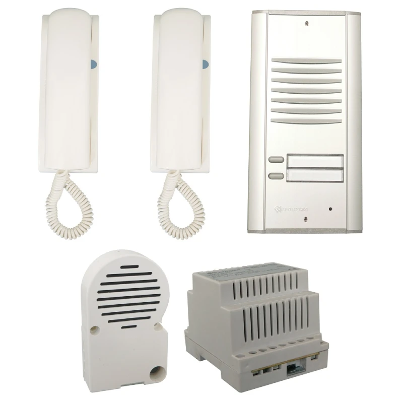 A FARFISA Project-ErreP/R szériájának 2 lakásos kaputelefon szettje egy megbízható, esztétikus és könnyen telepíthető megoldás, amely ideális választás szakemberek számára. A rendszer minden komponense a FARFISA jól ismert minőségét tükrözi, így biztos lehet benne, hogy hosszú távon is kiválóan fog működni.