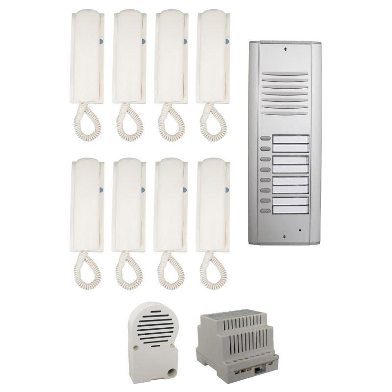 • 8 lakásos rendszer: A szett 8 különálló lakás számára biztosít kommunikációs lehetőséget, így ideális kisebb társasházak vagy irodák számára.