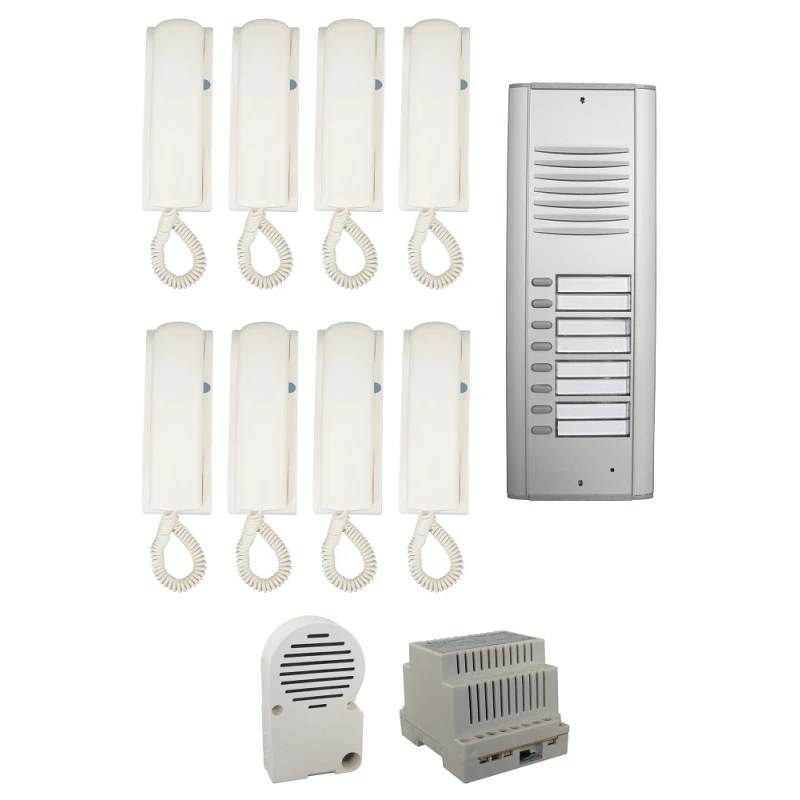 - 8 lakásos rendszer: A szett 8 különálló lakás számára biztosít kommunikációs lehetőséget, így ideális kisebb társasházak vagy irodák számára.