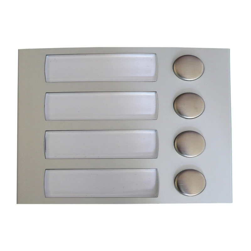 - 4 hívógomb: Az előlap négy különálló hívógombbal rendelkezik, amelyek lehetővé teszik több lakás vagy iroda egyszerű és gyors elérését. A gombok ergonomikus kialakításúak, biztosítva a kényelmes használatot.
