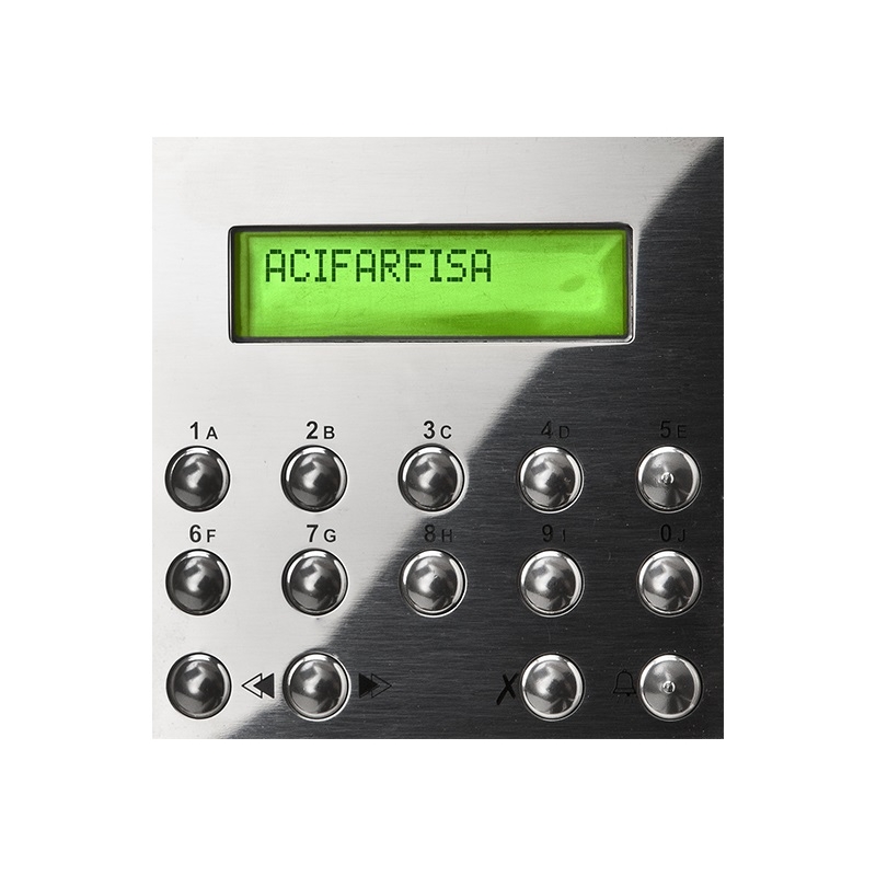 A FARFISA ACI Digitális Ajtóállomás ideális választás társasházak, irodaházak és egyéb professzionális környezetek számára, ahol a beléptetés biztonságos és hatékony kezelése elengedhetetlen. Az eszköz lehetővé teszi a felhasználók gyors és egyszerű azonosítását, valamint a belépési jogosultságok kezelését. A 16 karakteres, 2 soros kijelző tiszta és jól olvasható információkat nyújt, míg a numerikus és funkciógombok intuitív kezelhetőséget biztosítanak.