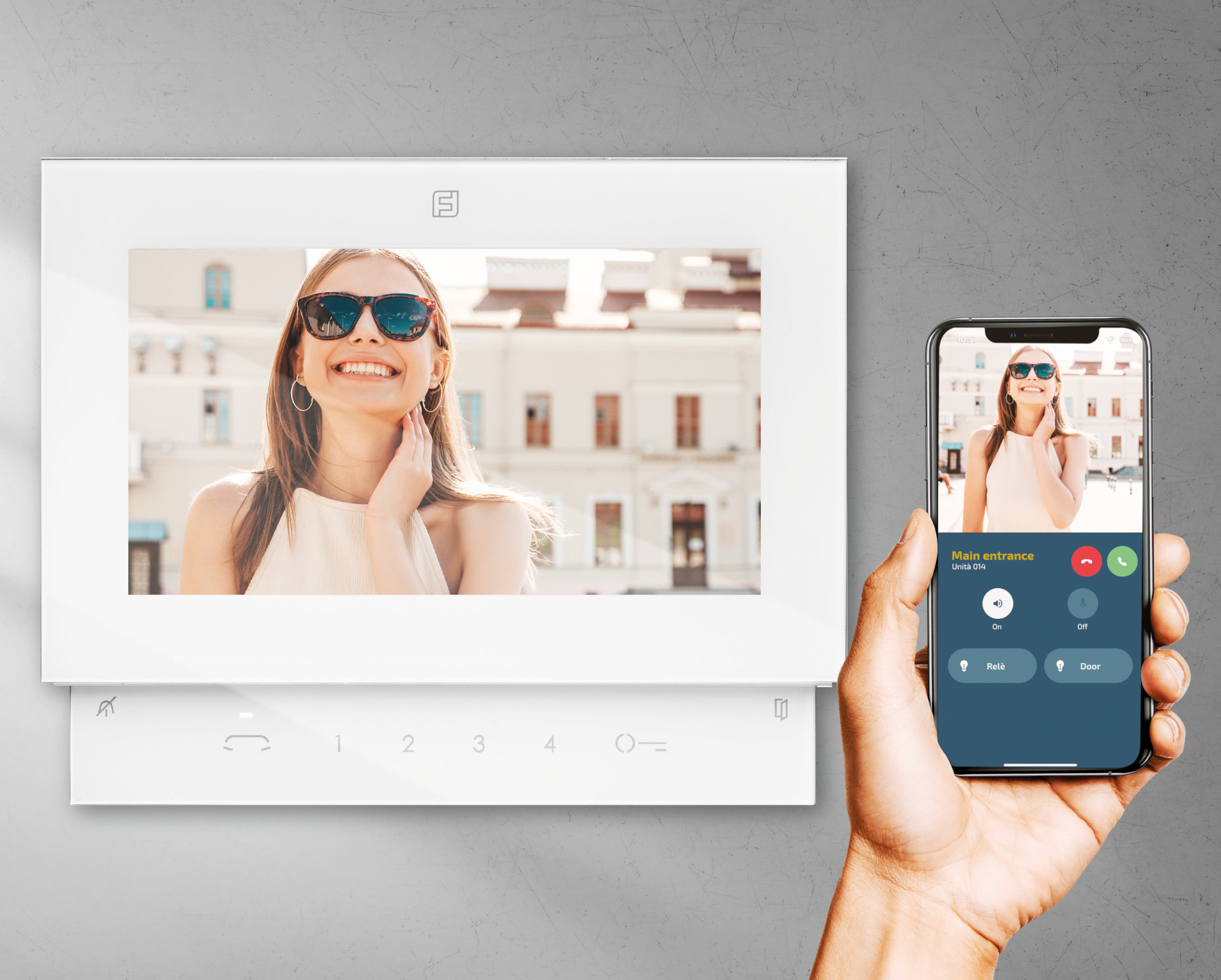 A 7 hüvelykes LCD TFT kijelző kiváló képminőséget biztosít, lehetővé téve a kültéri egység által közvetített kép részletes megtekintését. A fehér színű előlap elegáns megjelenést kölcsönöz a készüléknek, amely harmonikusan illeszkedik modern és klasszikus enteriőrökbe egyaránt.
