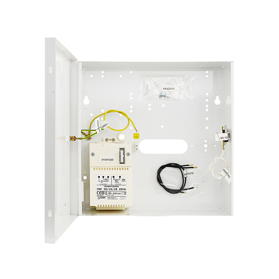 PULSAR fémház transzformátorral, Paradox központokhoz, TRP 20VA tápegység, 16V@1,2A / 18V@1A, 12V/7Ah akkuhely, tamper: 1xNC, PARADOX (728 ULT, E55, E65, MG5000) + PS817, SP4000, 5500, 6000 központokhoz, 2 x ZX8, PGM4, ACM12, APR3- ADM2, PS17 modulokhoz, fehér színű acéllemez ház, szabotázskapcsoló, IP30, méret 250x250x80 mm