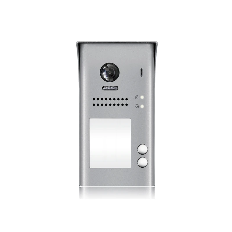 FUTURA Kültéri egység, 2 lakásos, 2 vezetékes, 2.0 MP-es, halszem optikás kamerával, 105°-os látószög, 2 hívógomb, 520 TV sor, 1/4" színes CMOS képérzékelő, automatikusan bekapcsoló világítás, cinkötvözet ház, , felületi szerelés, két típusú zárvezérlés, belső max. 12Vdc/250mA vagy külső (relékimenet 24Vdc/1A), állítható zárműködtetési idő, külső PIR modul illesztő, nagyméretű névtábla, működési feszültség: 24Vdc, teljesítményfogyasztás (készenléti/aktív) 0,8/3W, IP védelem: IP54, méret: 176x96x27mm, működési hőmérséklet -20°C-+55°C