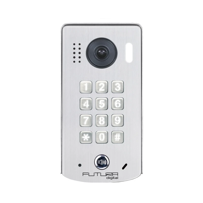 FUTURA 1 lakásos kaputábla, 72° látószögű kamerával, kódzáras, felületre szerelhető, esővédővel. Futura két vezetékes, polaritásmentes kaputelefonhoz. Zárnyitási lehetőség 1 - 99 másodpercig, zárnyitás kimenete: 12Vdc, 300mA relékimenetek száma: 1 ( NO / COM 48Vdc 1,5A ), 90mp beszélgetési idő beltéri egységből állítható, IP54 érintésvédelem, éjjeli LED világítás fényérzékelővel, működési hőmérséklet: -10°C - 45°C,