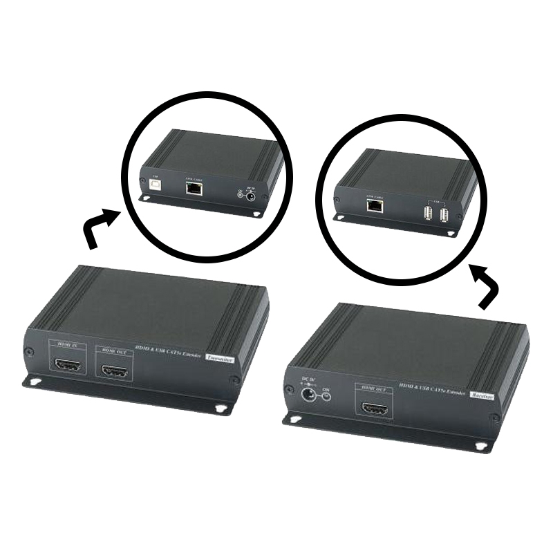 SC&,T HDMI és USB hosszabbító CAT5e/6 kábelen keresztül, adó és vevő, full HD felbontás támogatása (1920x1080), max. 120m átviteli távolság, adón beépített HDMI hurok kimenet, adón USB Type B bemenet, vevőn 2 USB (USB2.0/1.1/1.0) port kimenet egér és billentyűzet számára, távoli számítógépek és megfigyelőállomások számára, max. fogyasztás adó/vevő 1.2A/0.8A, méret adó/vevő: 125x125x30 mm, súly: adó/vevő 355g/350g, ajánlott modell: SR01 jelismétlő a távolság növeléséhez