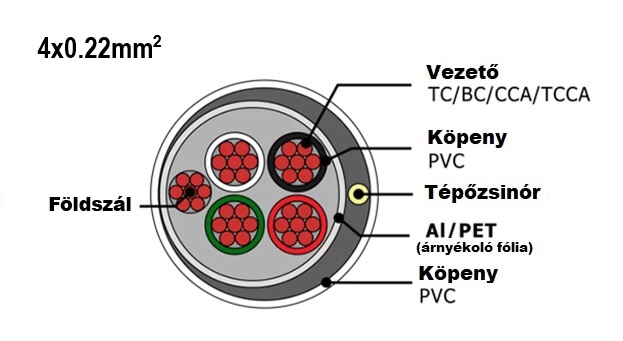 - 4×0,22 mm2 sodrott rézvezető, alacsony jelszintű átvitelhez optimalizálva