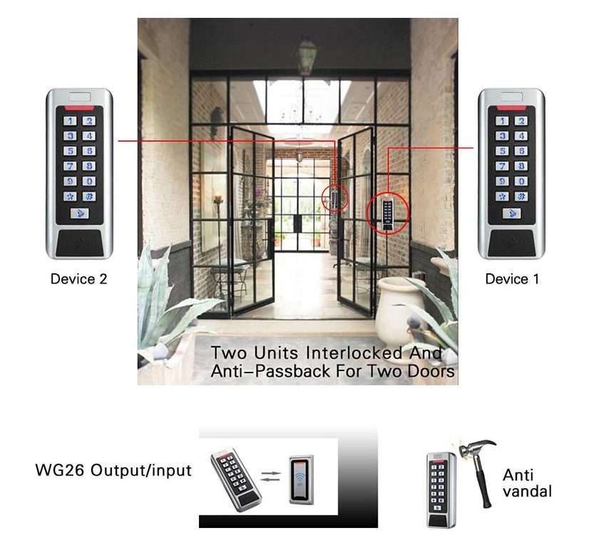 HONNOR SECURITY HS-CC1 - Fémházas, IP65 vízálló, két relés, RFID EM kártyaolvasó és önálló beléptető, fém billentyűzettel,