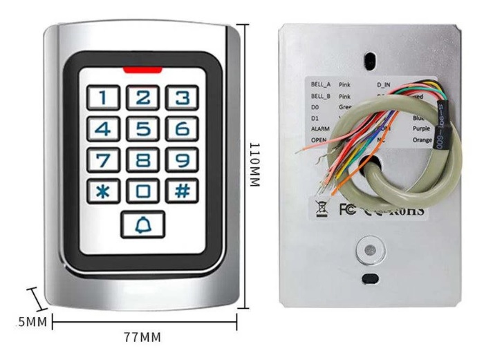 | Csatlakozások | Elektromos zár, kilépő gomb, külső riasztó |
