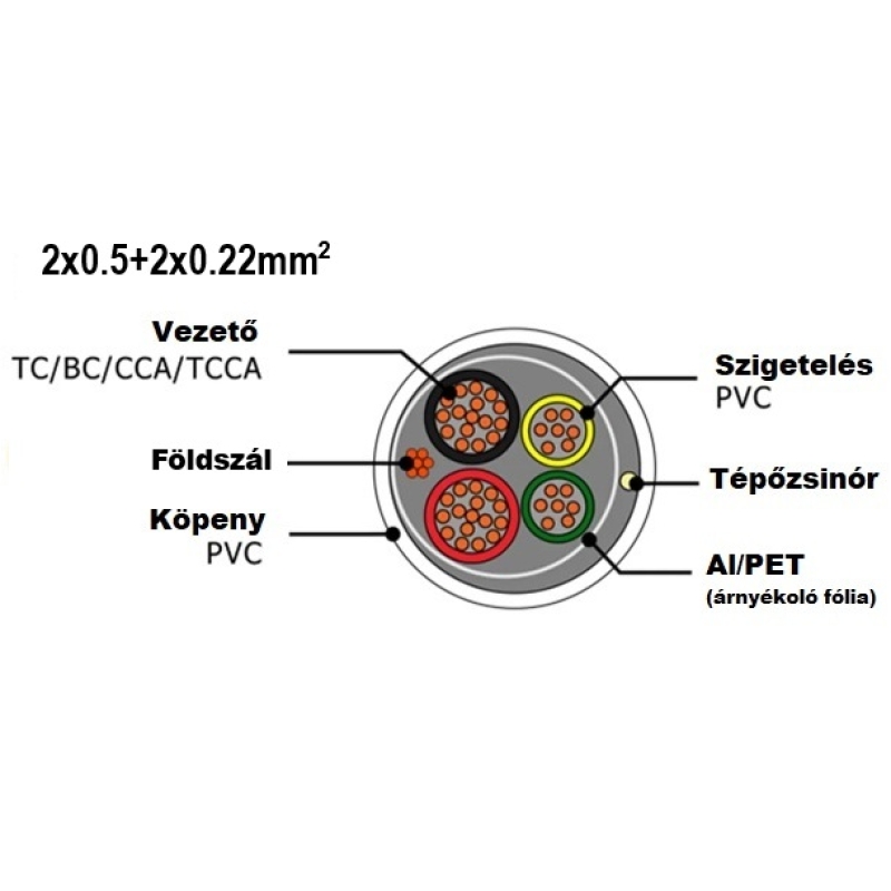 - Vezetők száma és keresztmetszete: 2x0,50 mm2 + 2x0,22 mm2