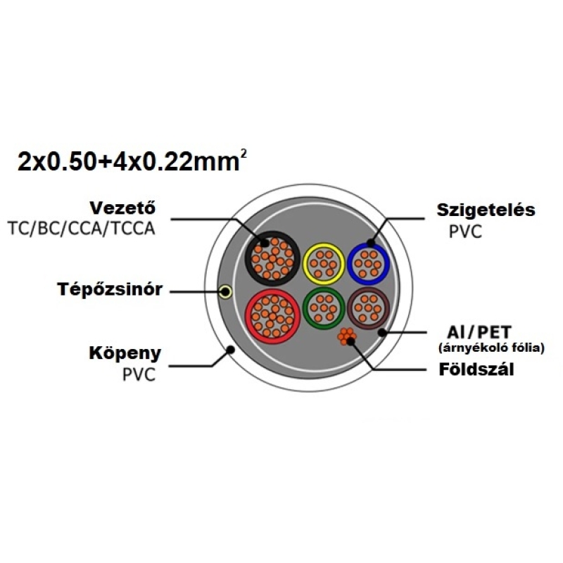 - Érvezetékek száma: 6 (2 x 0,50 mm2 + 4 x 0,22 mm2)