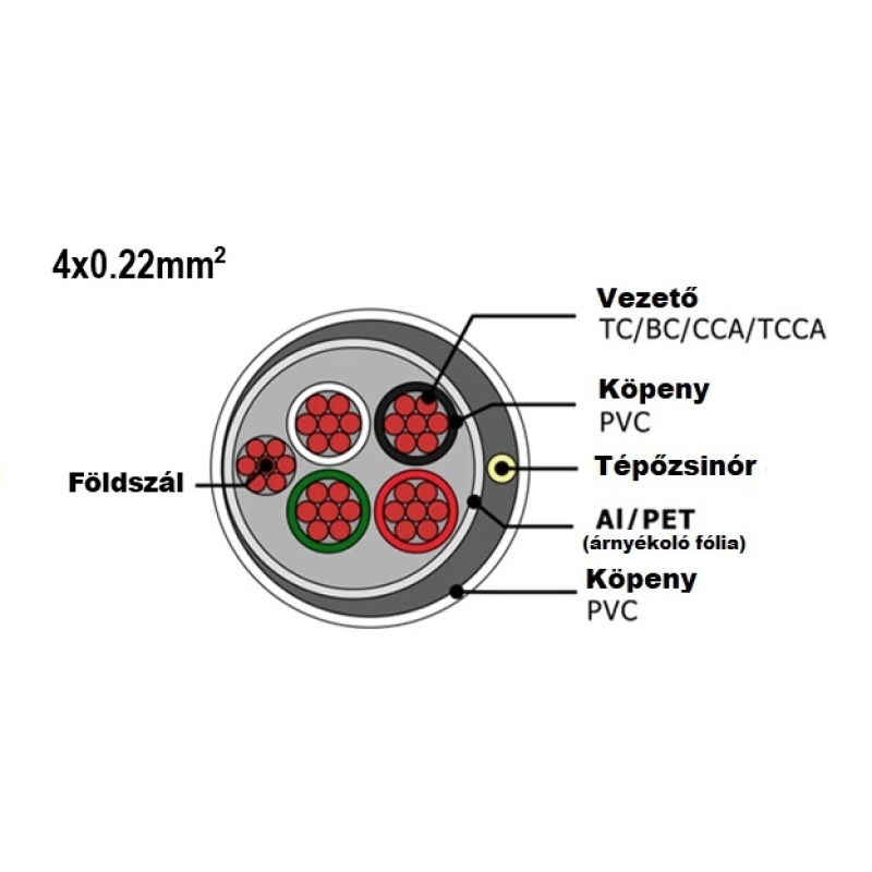 - Vezetők száma és típusa: 4 × (7×0,20 mm) sodrott réz (BC)